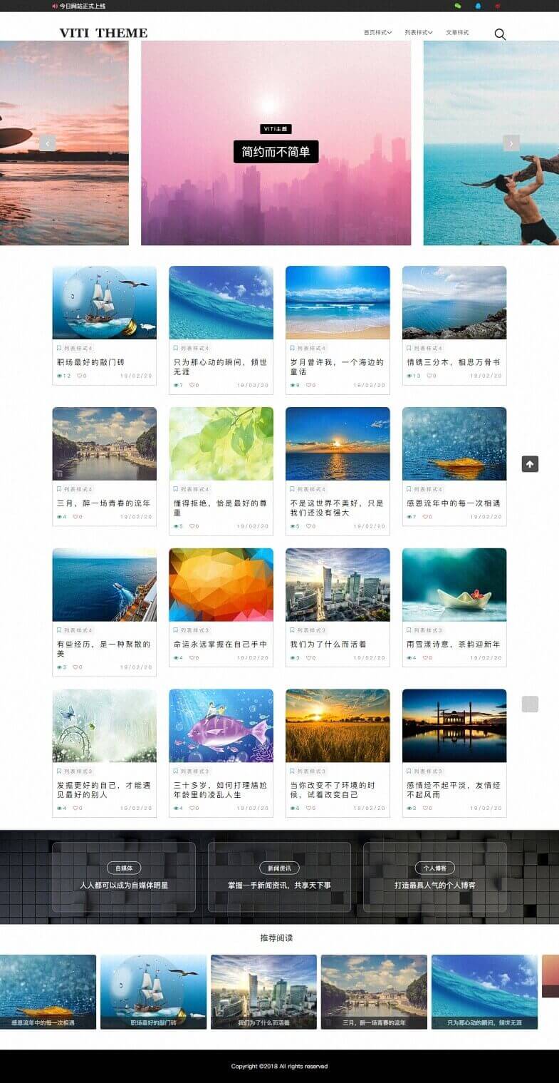 Viti 主题是网站推出的第一款WordPress 主题,适用于新闻、自媒体和个人博客网站 。设计上采用简约大气的设计风格,简约却不简单,大气却不浮夸。
