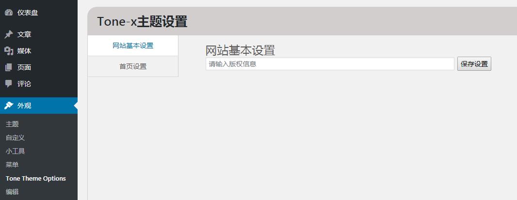 第一个函数用来输出更新设置选项时的验证数据,第二个隐藏域也固定不变,第三个隐藏域,value的值为前面表单的值,比如我们前面只有一个文本输入框tone_copy_right,所以这里的value值就一个,如果我们有很多个文本输入框,比如input1、input2、input3这里的value值应该三个都写上,并且用逗号隔开: value=”input1,input2,input3″。在optinos保存设置数据的时候就根据这个隐藏域中的值来保存。